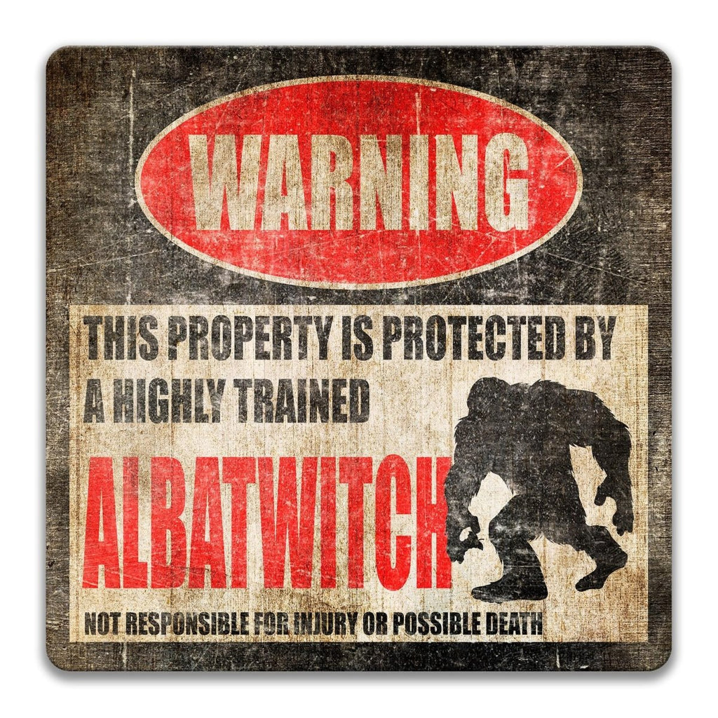 Pair your Albatwitch sign with more regional and American cryptid warnings to create a full folklore-inspired property line. Popular matching designs include the Beast of Busco, Bessie of Lake Erie, Loveland Frogman, Mothman, Jersey Devil, and other novelty cryptid warning signs that add character to cabins, farms, wooded yards, and outdoor gathering spaces.