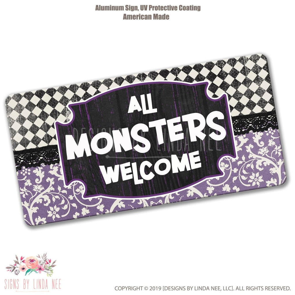 The All Monsters Welcome Sign is a handcrafted Halloween welcome sign designed to add spooky charm and festive spirit to your home's entrance, porch, or seasonal wall. This durable metal sign features a UV protective coating that prevents fading and rust, making it an ideal outdoor Halloween sign that lasts year after year. Perfect as a front door decoration, it welcomes trick-or-treaters and party guests with playful style while enhancing your spooky home accent.