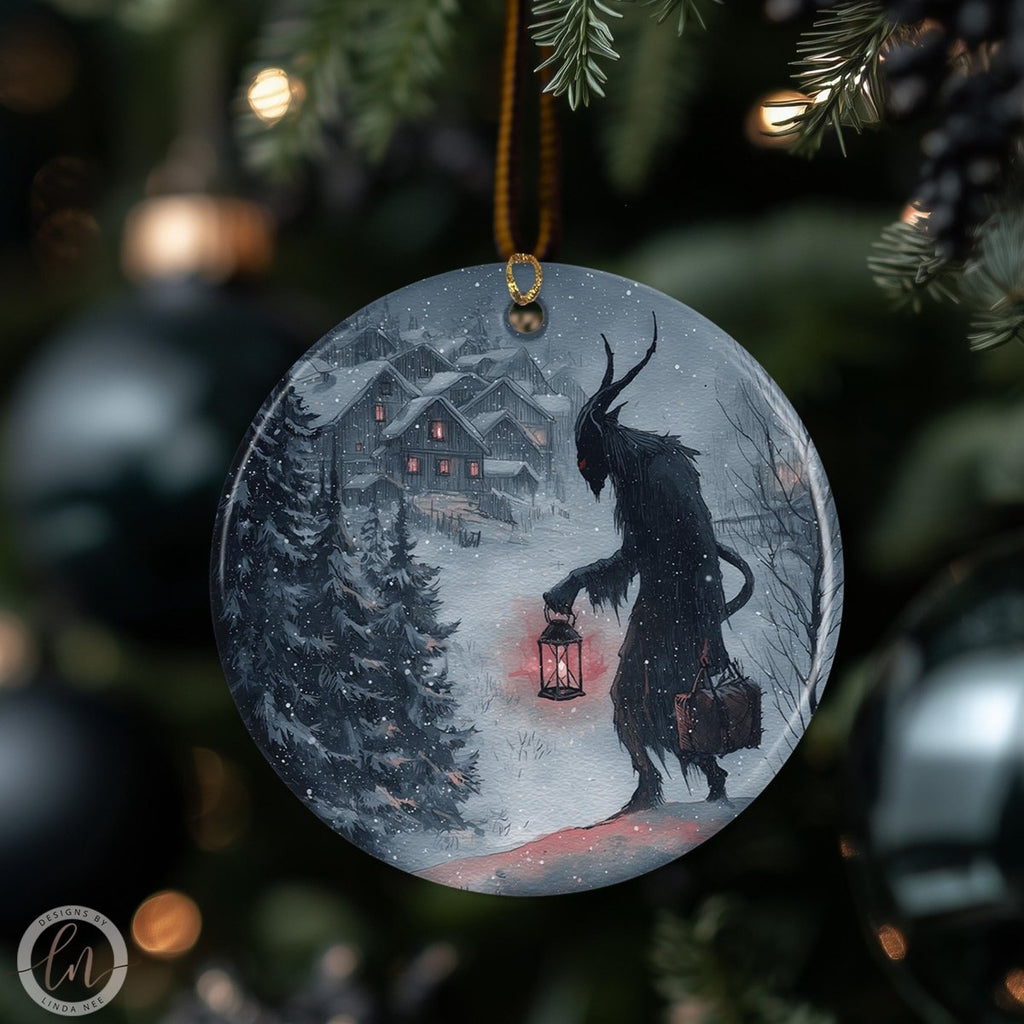 Each ornament measures 3" and is crafted from glossy ceramic, with artwork permanently infused into the surface—never vinyl or stickers. The vivid, fade-resistant color preserves every detail of the lantern, snow, and old-world village scene. The back is smooth white, and each piece includes a metallic gold hanging cord for easy display. Every ornament is custom printed in our New Hampshire studio with exclusive Designs by Linda Nee artwork, making it a collectible piece you won’t find in big-box stores. Built to last, it’s perfect for anyone who loves Krampusnacht folklore, spooky Christmas themes, or dark alpine winter stories.