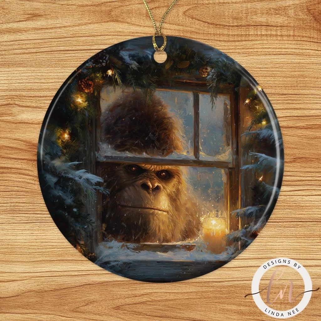 Each ornament is crafted to highlight painterly detail, rich color, and the cozy folklore feel of winter storytelling. Ideal for cryptid Christmas decorating, Sasquatch-themed holiday gifts, and woodland cabin trees, this piece blends charm, warmth, and a hint of paranormal whimsy.