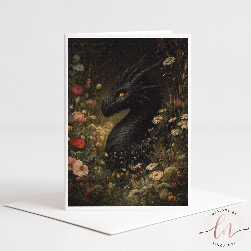 This black dragon floral greeting card captures a powerful dragon nestled among glowing wildflowers and tall grasses, illuminated by soft golden light against a dark, moody background. Designed for fantasy readers, romantasy fans, and lovers of gothic cottagecore art, this blank greeting card blends strength and enchantment in one unforgettable illustration.