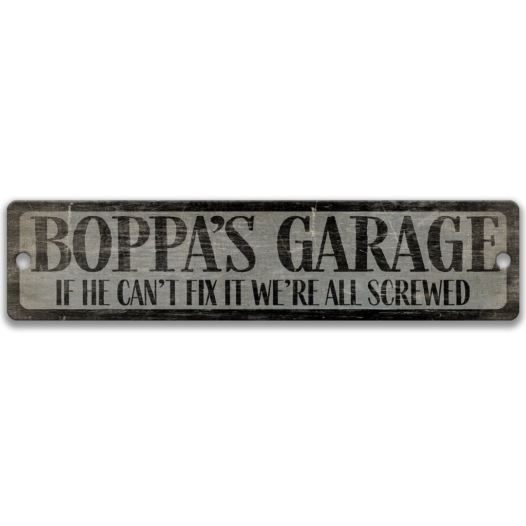 This Boppa’s garage metal sign brings humor and personality to garages, workshops, and man caves. Featuring the classic “If he can’t fix it, we’re screwed” message, it’s a playful nod to the family fixer whose garage is the last stop before calling it quits.