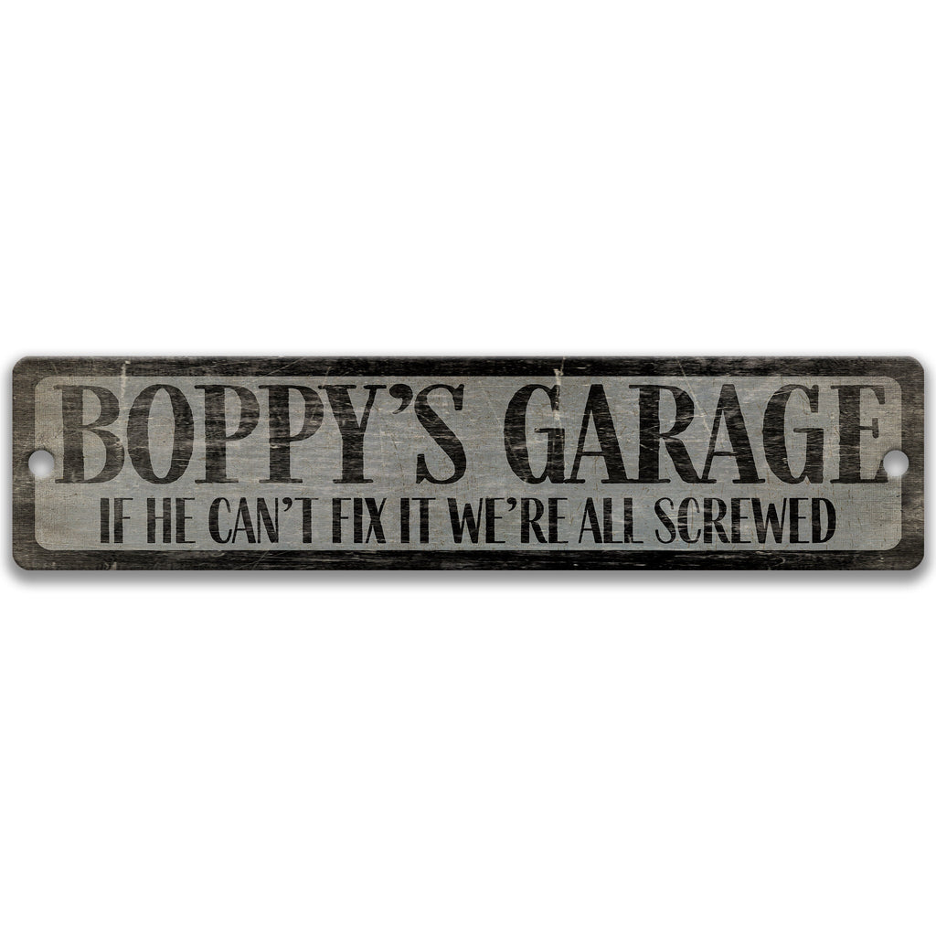 Boppy is the one everyone calls when a toy breaks, a bike chain slips, or the car starts making “that noise.” This funny Boppy’s garage street metal sign makes it official with a bold message that gives him the credit and responsibility he’s earned.