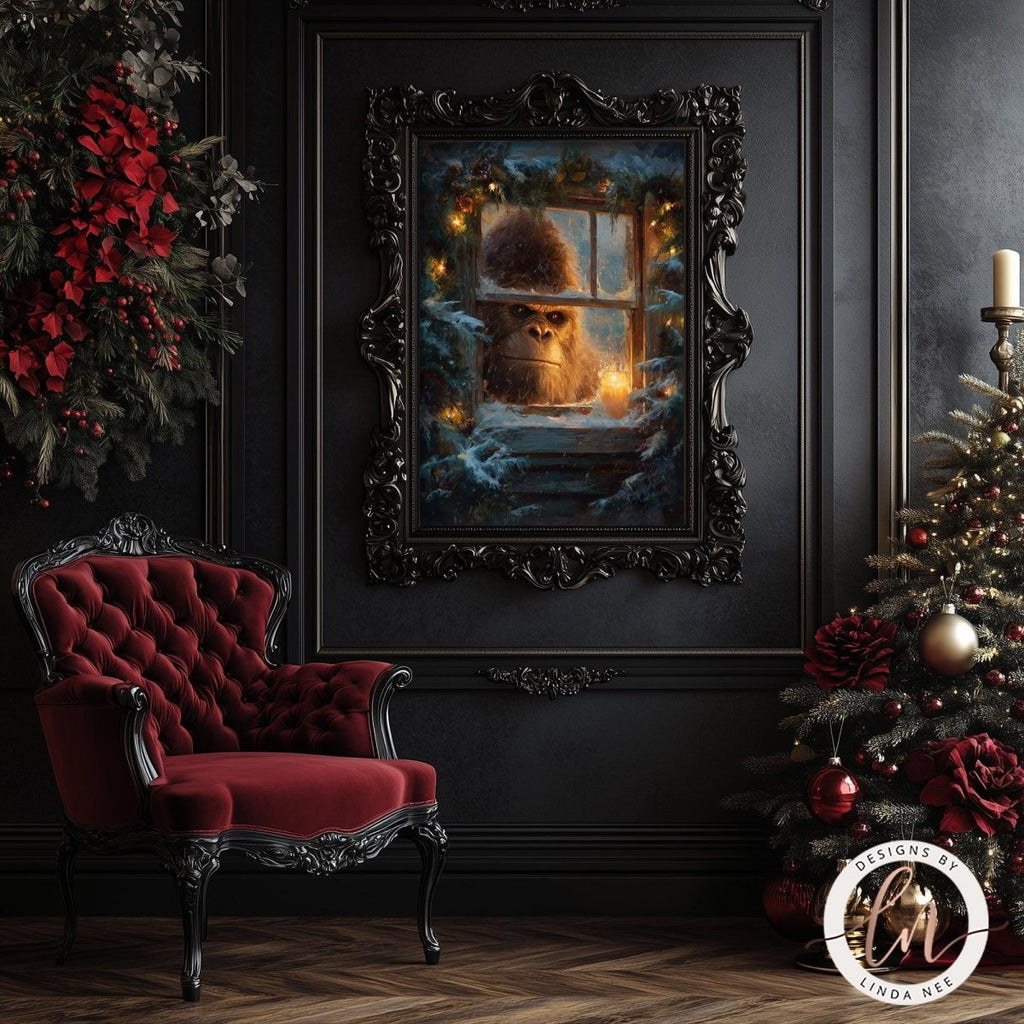 Pair this Bigfoot print with Krampus, Mothman, and other cryptid holiday pieces for a full “monsters at the window” gallery wall. Mix with candlelit still lifes, ravens, and dark forest artwork to build a witchy winter theme. Add matching ornaments and warning signs for a cohesive, cozy folklore look.
