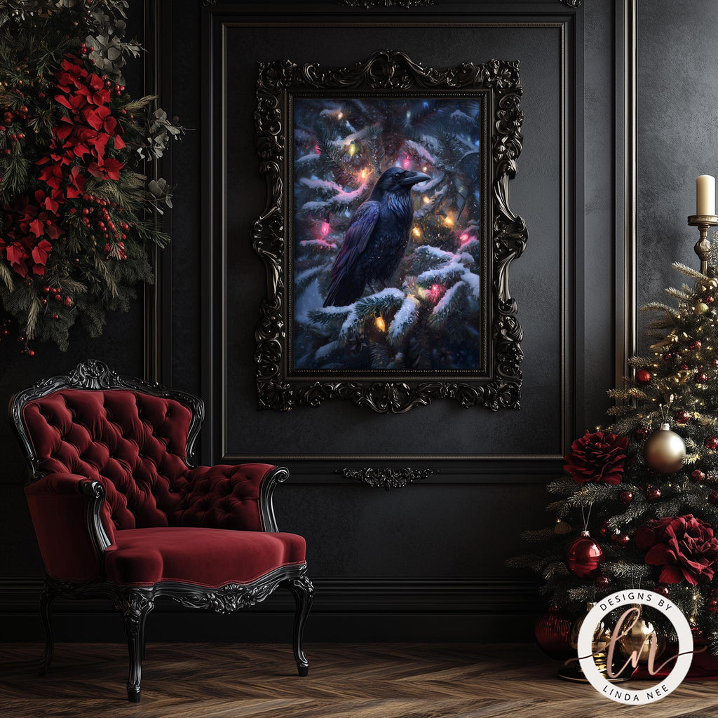 Ideal for gothic Christmas decor, raven art lovers, and dark winter gallery walls