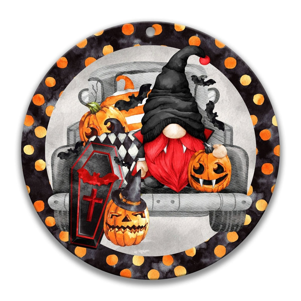 The Dracula gnome wreath sign brings a playful gothic touch to your Halloween décor, perfect for front door Halloween signs and seasonal holiday decorations that delight guests and trick-or-treaters alike. This durable aluminum sign is professionally printed on heavy-gauge metal, ensuring a weather-resistant wreath sign that resists fading and rust for years of spooky Halloween display. Measuring from 3" up to 24", it fits any space as a Halloween wreath sign, vampire gnome decor, or gnome Halloween wall art.