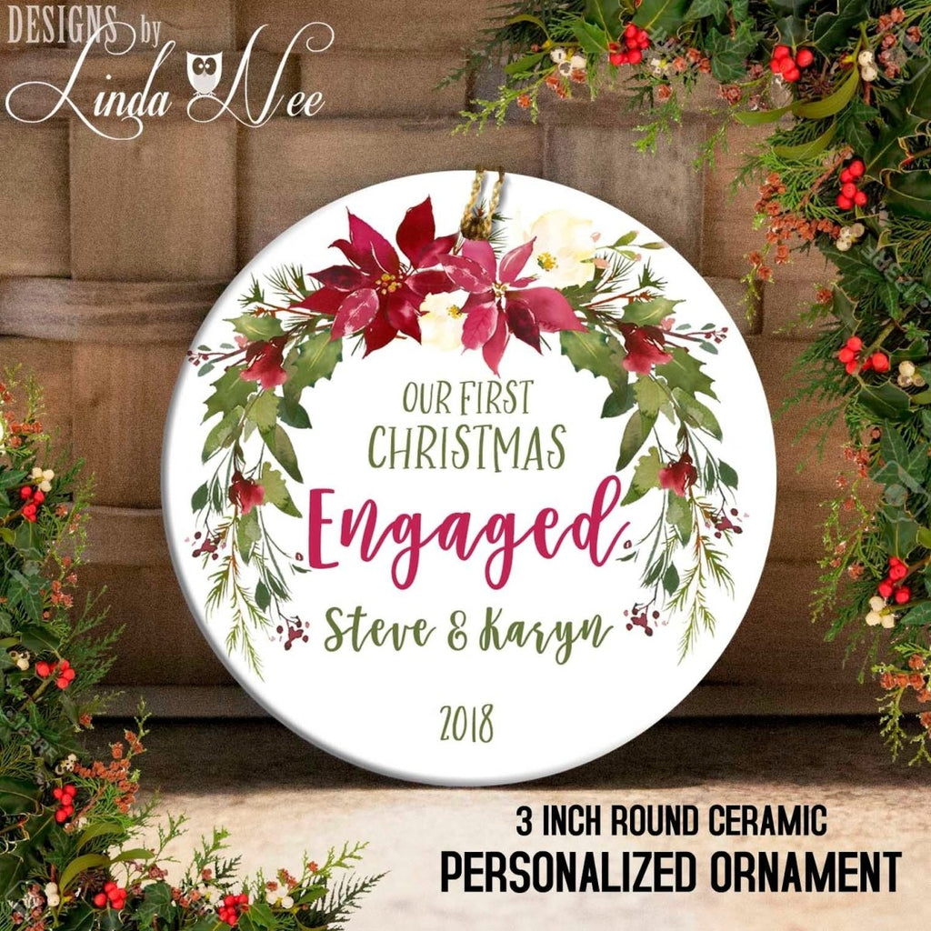 This personalized engagement ornament brings a warm, festive touch to your holiday tree, perfect for couples celebrating their first Christmas engaged in 2025. Designed for those who love meaningful keepsakes, this piece blends the charm of classic Christmas ornaments with the joy of marking a once-in-a-lifetime milestone. Its soft poinsettia artwork and elegant personalization make it a beautiful gift for newly engaged couples, holiday engagements, or winter proposal celebrations. Ideal for anyone searching for unique Christmas ornaments, personalized engagement ornaments, or sentimental holiday decor, it becomes a keepsake that will be cherished year after year.