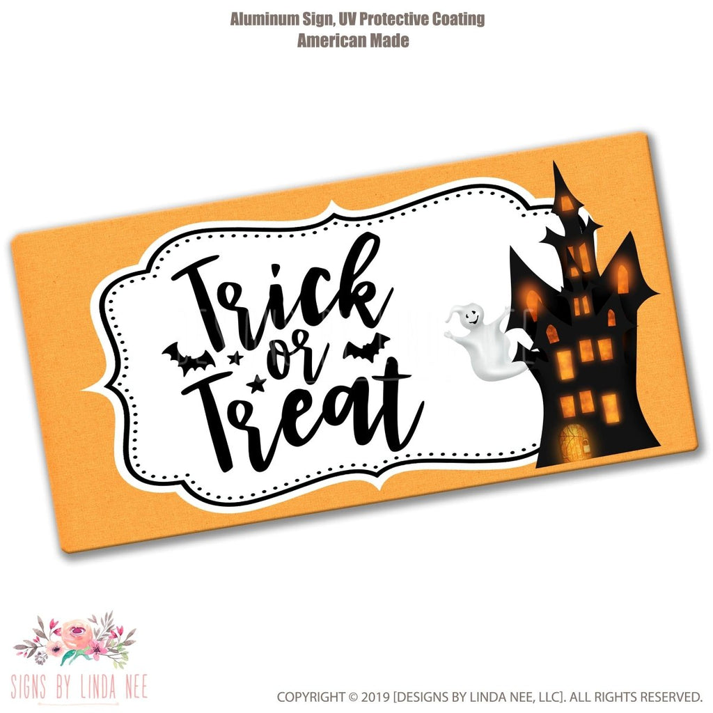 The Ghost Trick or Treat Sign is a durable aluminum sign designed to enhance your outdoor Halloween decor with a spooky charm that welcomes trick-or-treaters in style. This Halloween metal sign features a UV-protected metal sign finish that prevents fading and rust, ensuring long-lasting use as a festive yard decoration or Halloween wreath centerpiece. Crafted by Designs by Linda Nee, this ghost porch sign combines handcrafted Halloween art quality with reliable durability for seasonal holiday signage that lasts year after year.