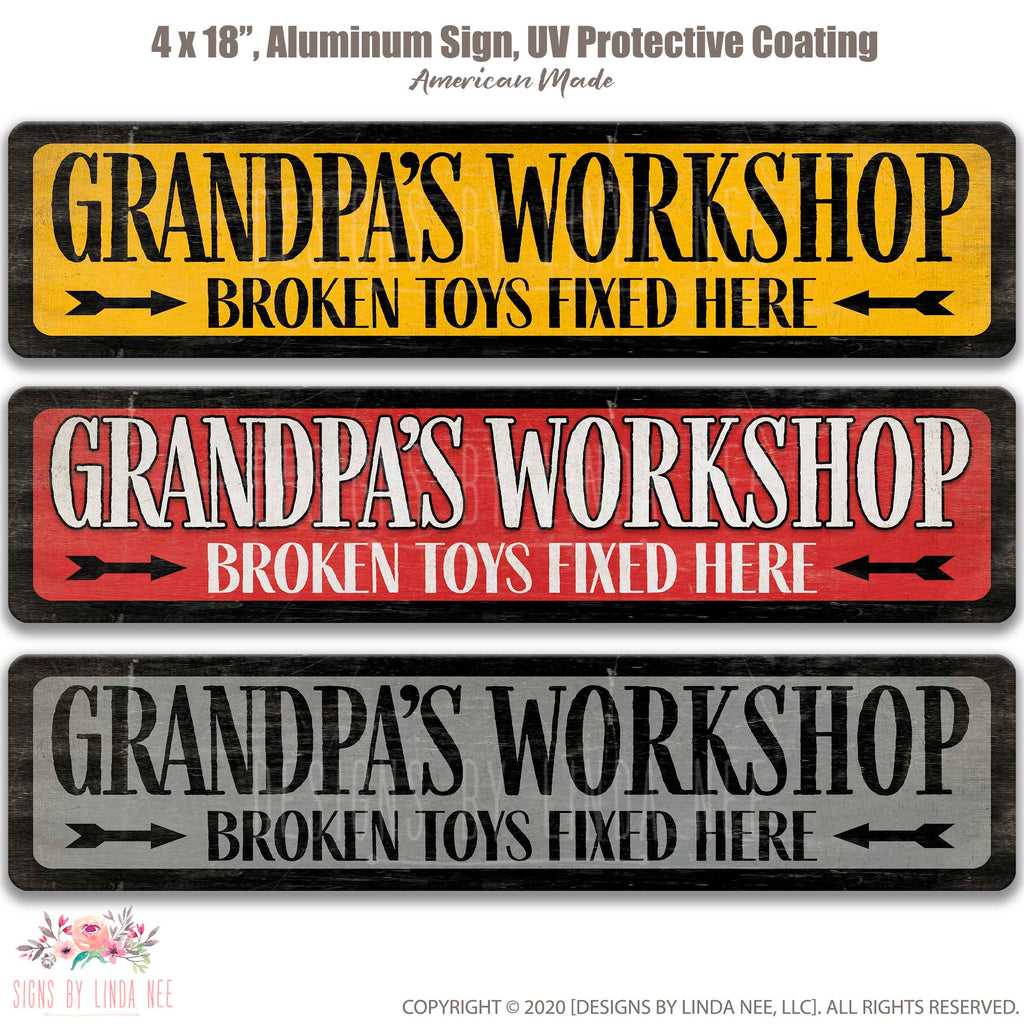 As a personalized garage sign, it’s especially meaningful for grandfathers who enjoy building, fixing, restoring, or repairing toys and household items.
