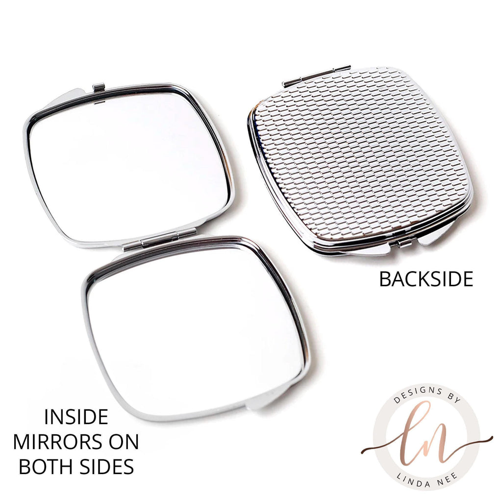 Made from polished silver metal with a sublimated aluminum insert, the artwork stays vivid and fade-resistant even after years of use. The dual-mirror design includes both standard and magnified reflections, making it ideal for makeup touch-ups or quick checks on the go. Slip this mystical mirror into your purse, travel bag, or pocket and let it add a hint of moonlit magic to your day.