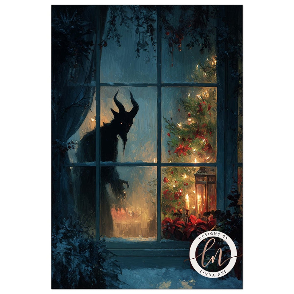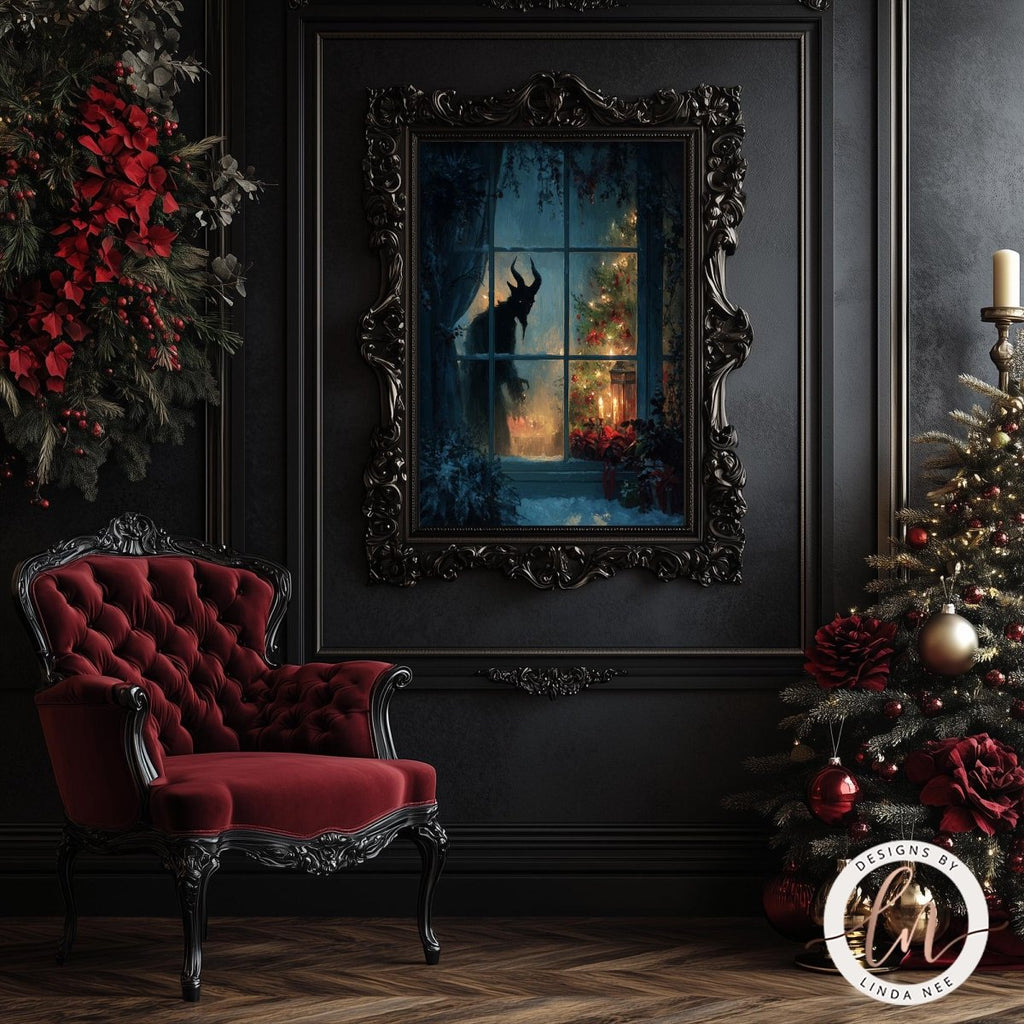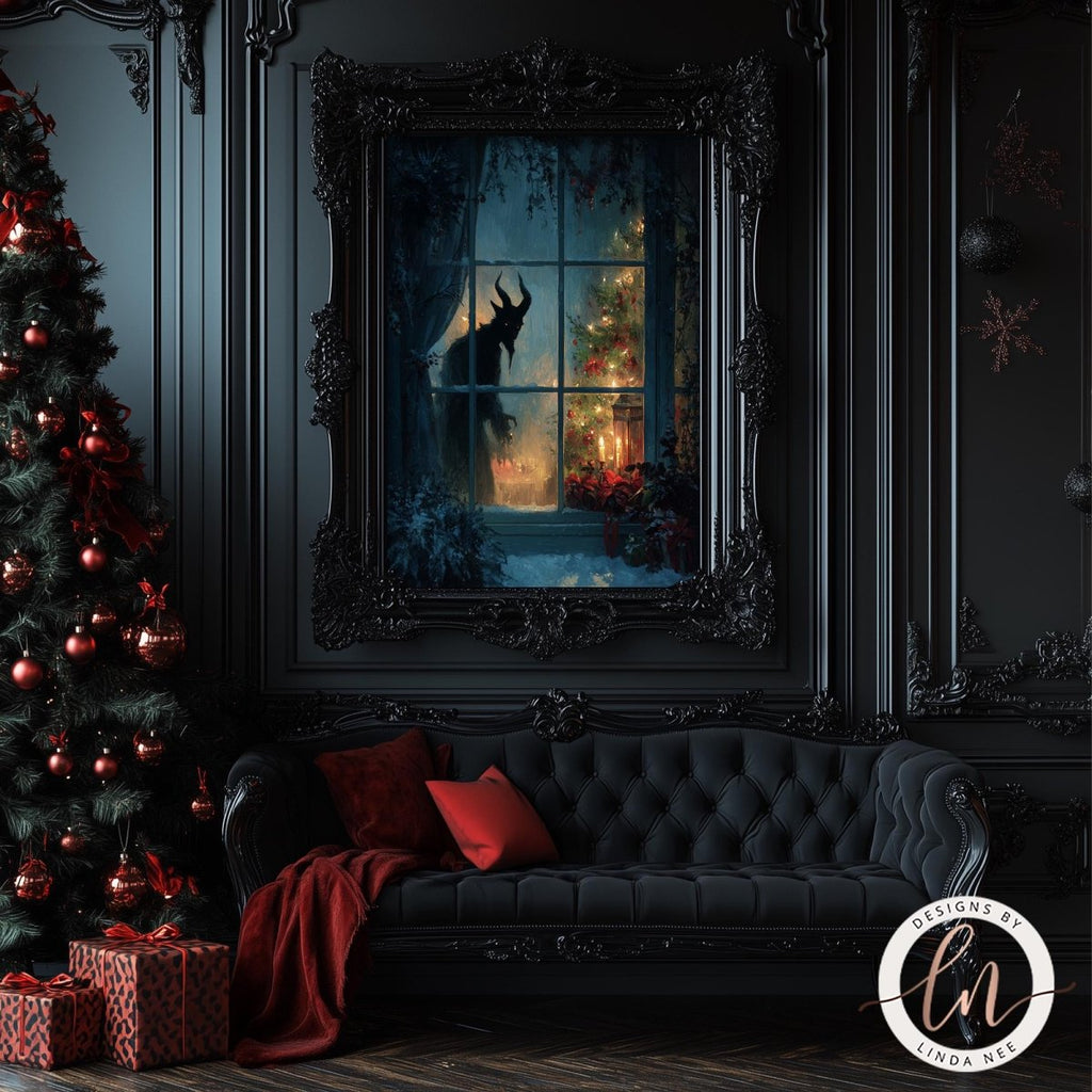 Pair this Krampus wall art with my other dark Yule designs, gothic window scenes, and cryptid Christmas prints to create a fully immersive seasonal display. Add ravens, snowy forests, candlelit still lifes, or matching Krampus ornaments for a cohesive gothic holiday atmosphere.