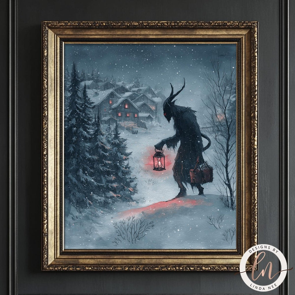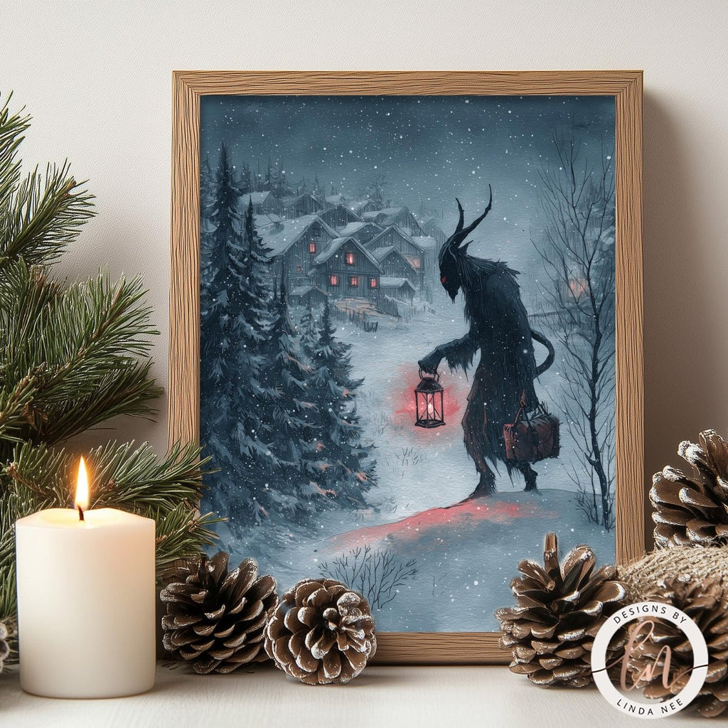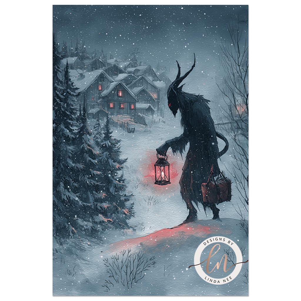 This Krampusnacht Winter Village print brings dark folklore to life, capturing a horned Krampus figure striding through the snow with a lantern and battered suitcase as a distant alpine village glows with eerie warmth. Moody and cinematic, it blends folk horror charm with old-world winter magic—perfect for Gothmas decorating, Yule altars, and anyone who prefers their holiday art on the darker side.