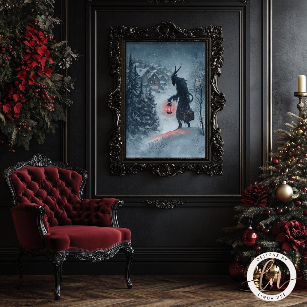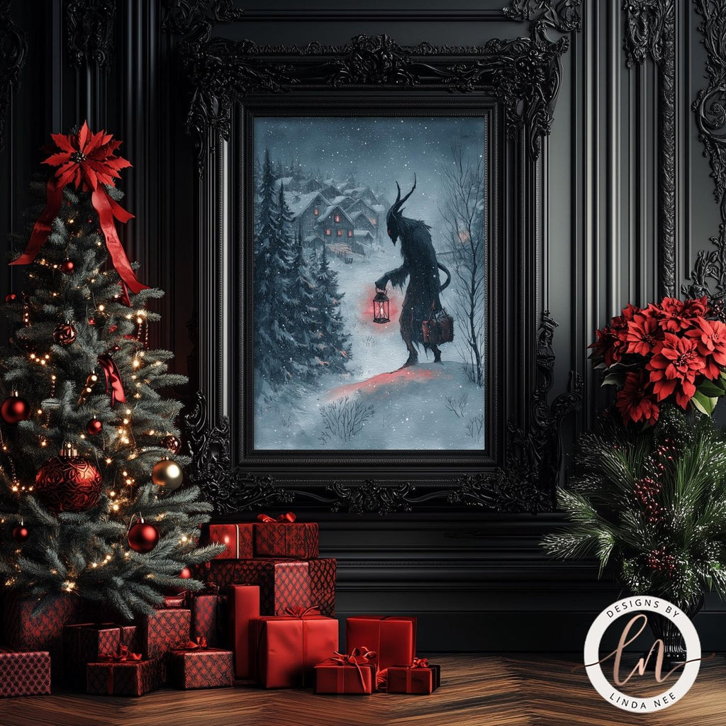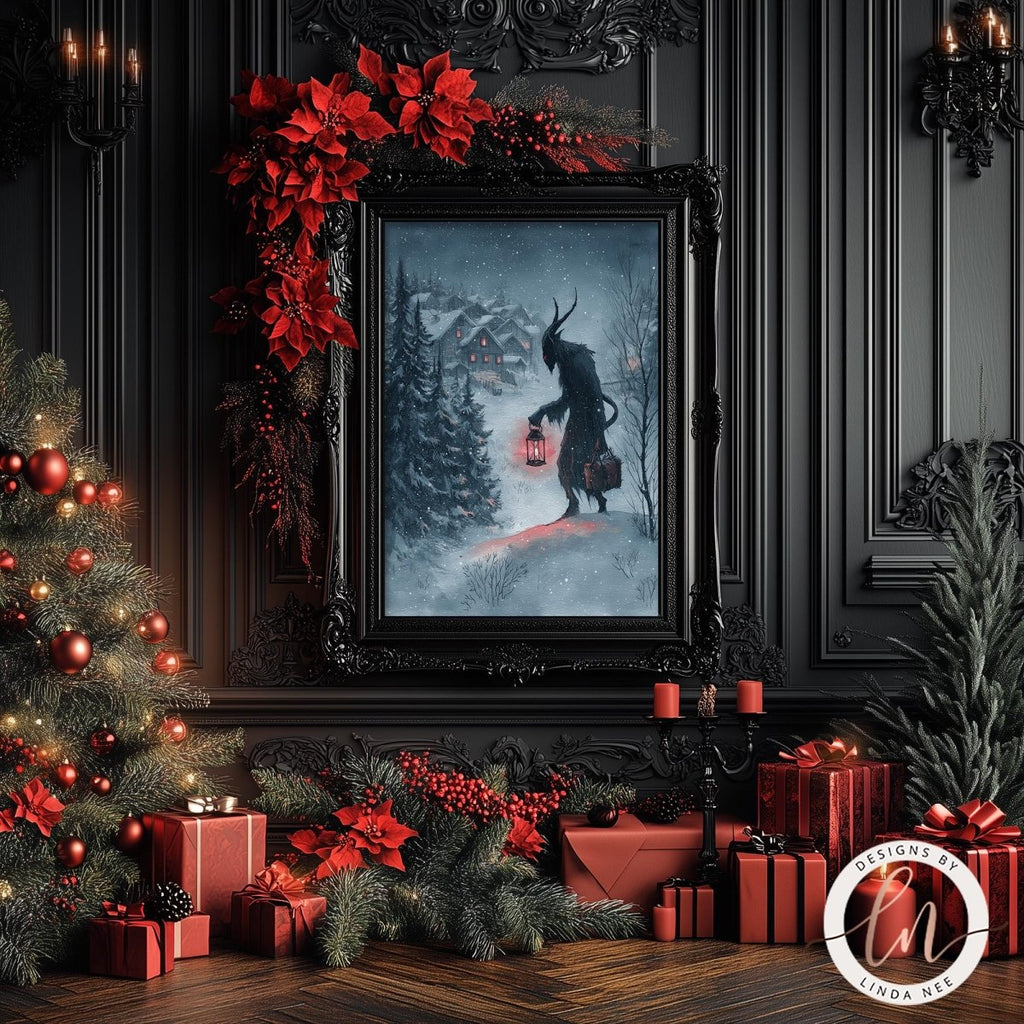 This Krampusnacht Winter Village print brings dark folklore to life, capturing a horned Krampus figure striding through the snow with a lantern and battered suitcase as a distant alpine village glows with eerie warmth. Moody and cinematic, it blends folk horror charm with old-world winter magic—perfect for Gothmas decorating, Yule altars, and anyone who prefers their holiday art on the darker side.