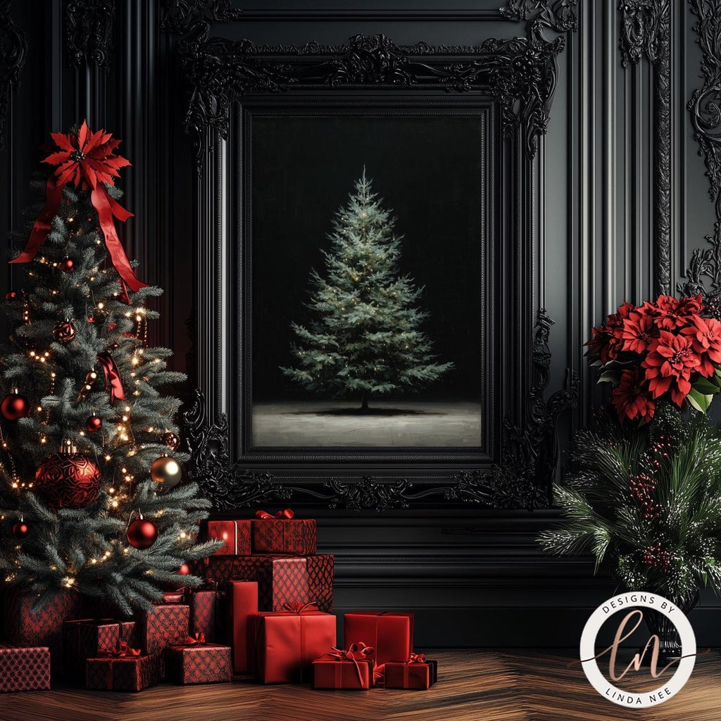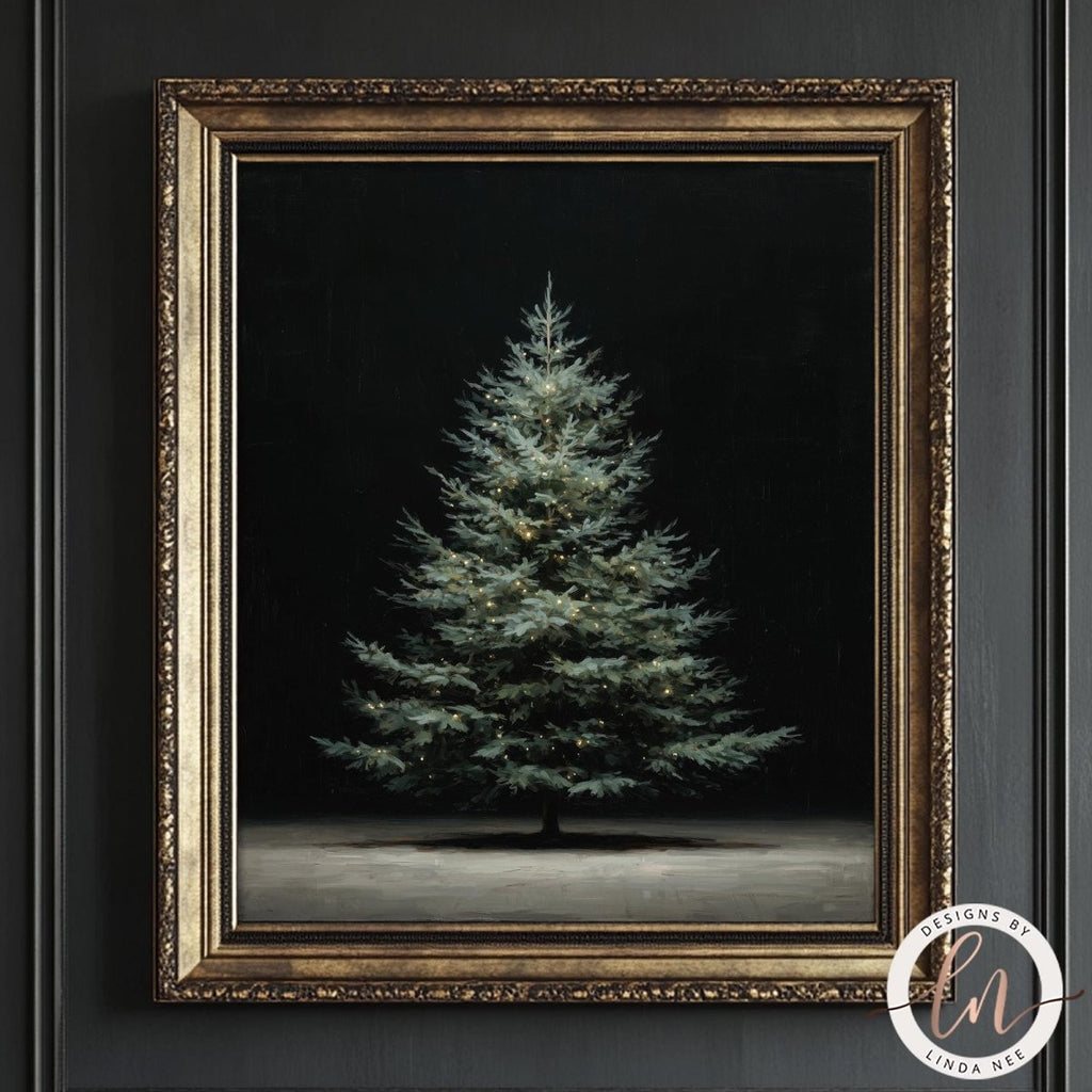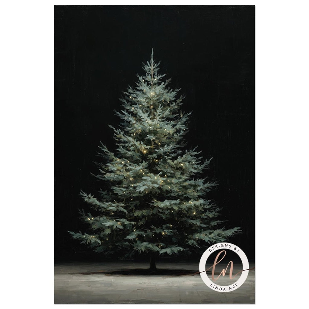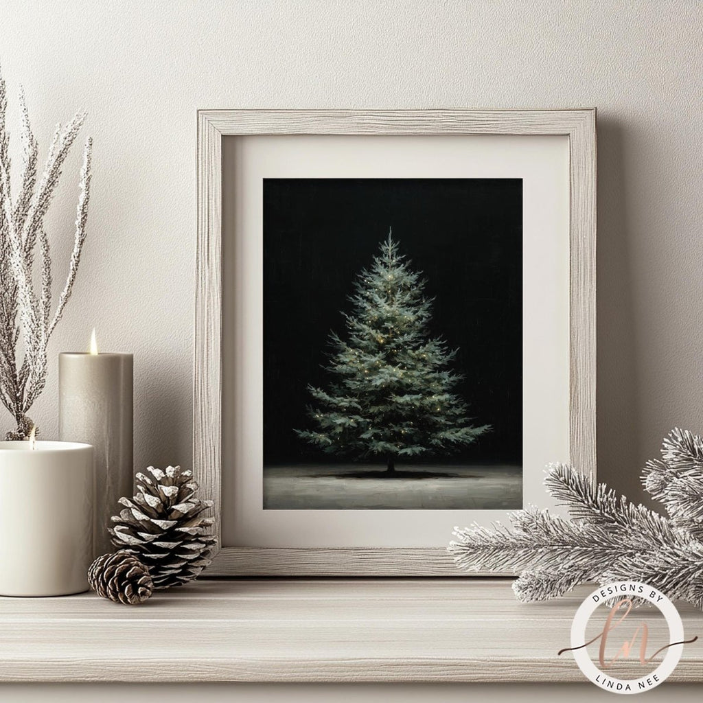 This moody winter tree wall art print captures a softly lit evergreen standing against a deep black night sky, its tiny lights shimmering like distant stars. Minimalist, atmospheric, and beautifully cinematic, it adds a calm, modern touch to Christmas décor and fits seamlessly into Scandinavian, gothic, cottagecore, and dark-academia interiors.