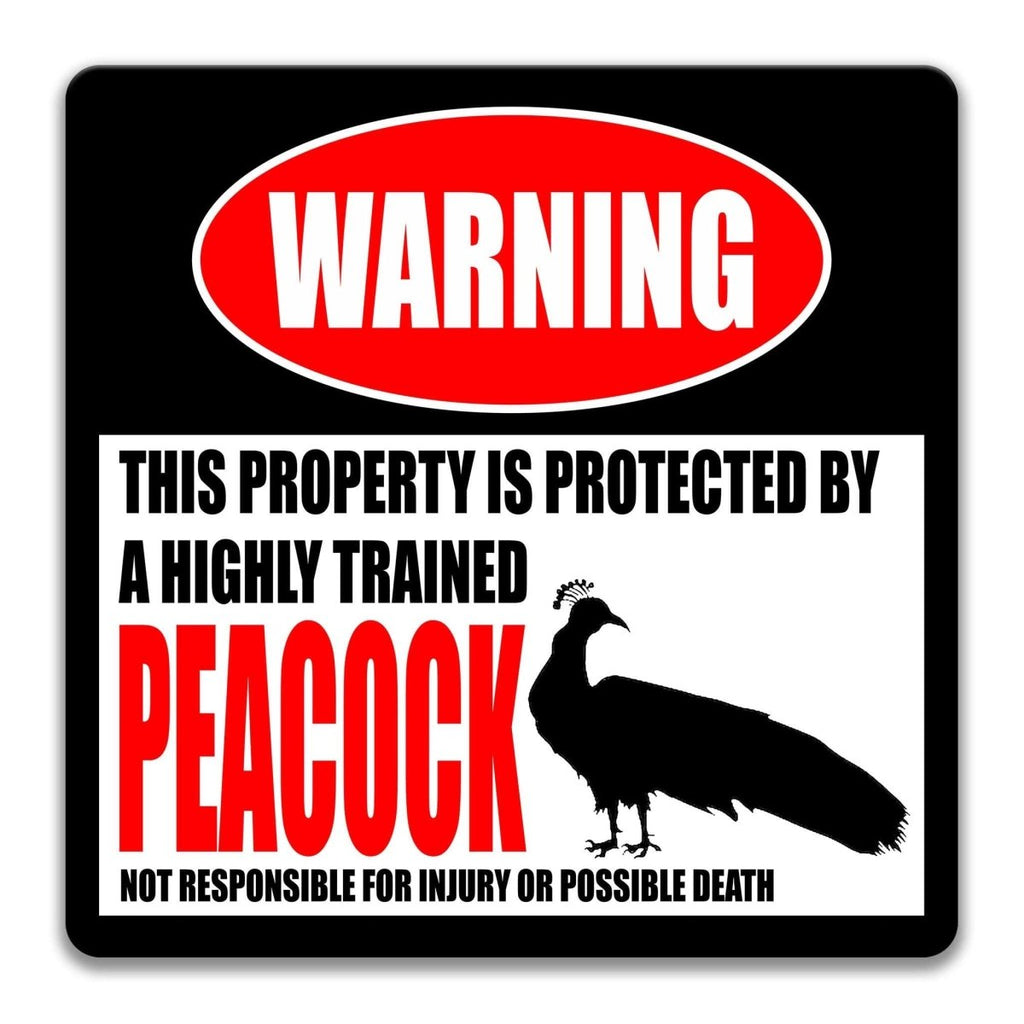 Add vibrant humor and bird-lover charm to your property with this Peacock Property Warning Sign. Order yours today and let your “trained” peacock stand guard in style.