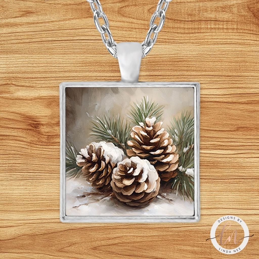 Celebrate the cozy charm of the season with our Pinecone Still Life Necklace and Keychain, exclusively designed by Designs by Linda Nee. This enchanting artwork features three snow-dusted pinecones nestled among lush evergreen branches, set against a soft, wintry backdrop. The painting beautifully captures the simplicity and warmth of a rustic farmhouse Christmas, making it a timeless accessory that reflects the quiet beauty of nature during the holidays.
