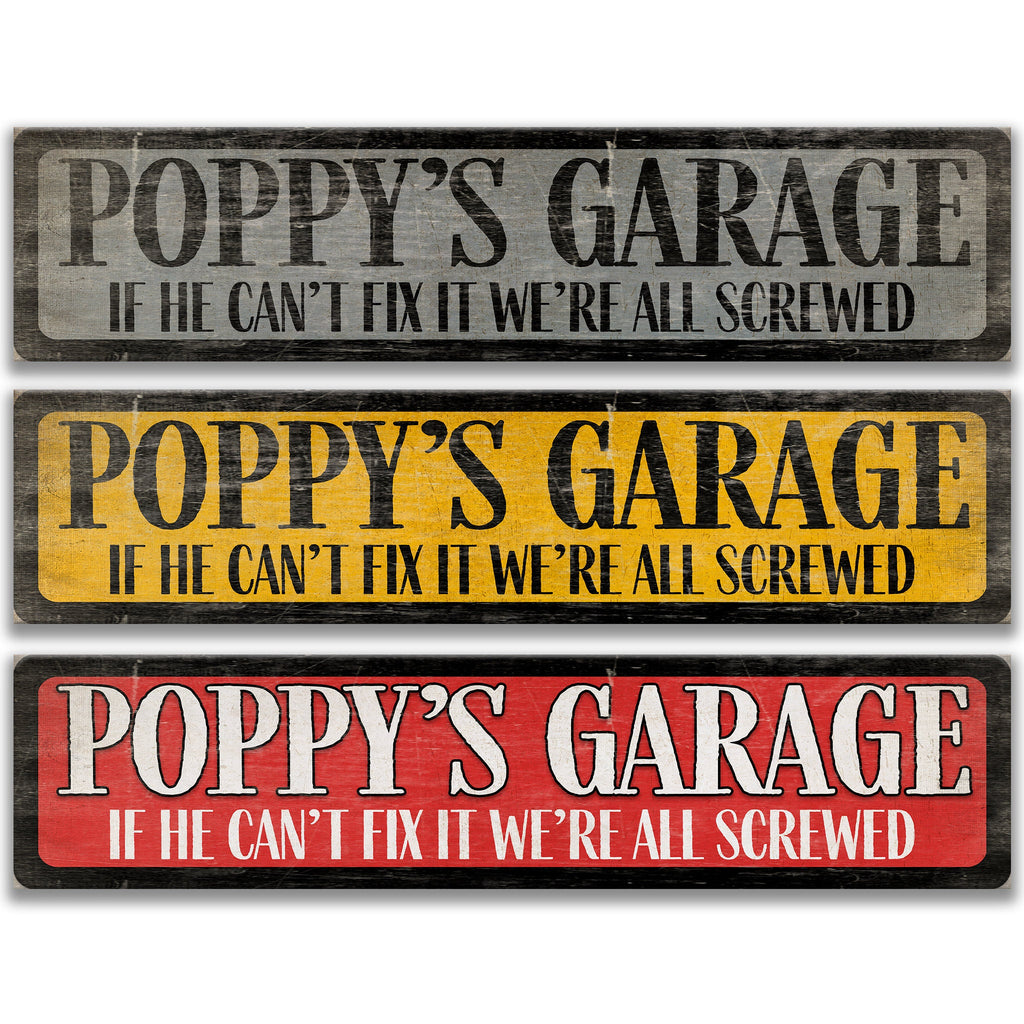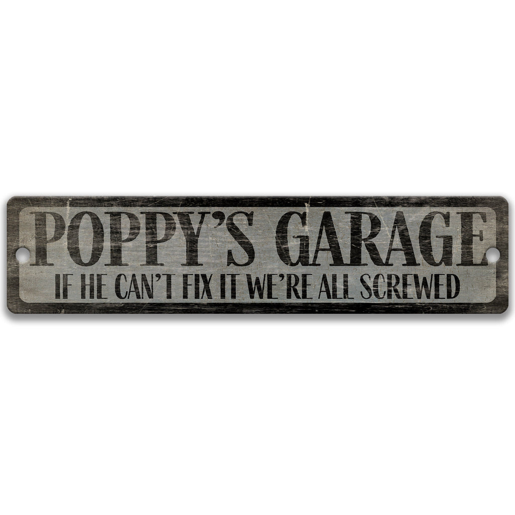 This Poppy’s garage metal sign adds humor and personality to garages, workshops, and man caves. Featuring the familiar “If he can’t fix it, we’re screwed” message, it’s a playful tribute to the one everyone relies on when something needs fixing.