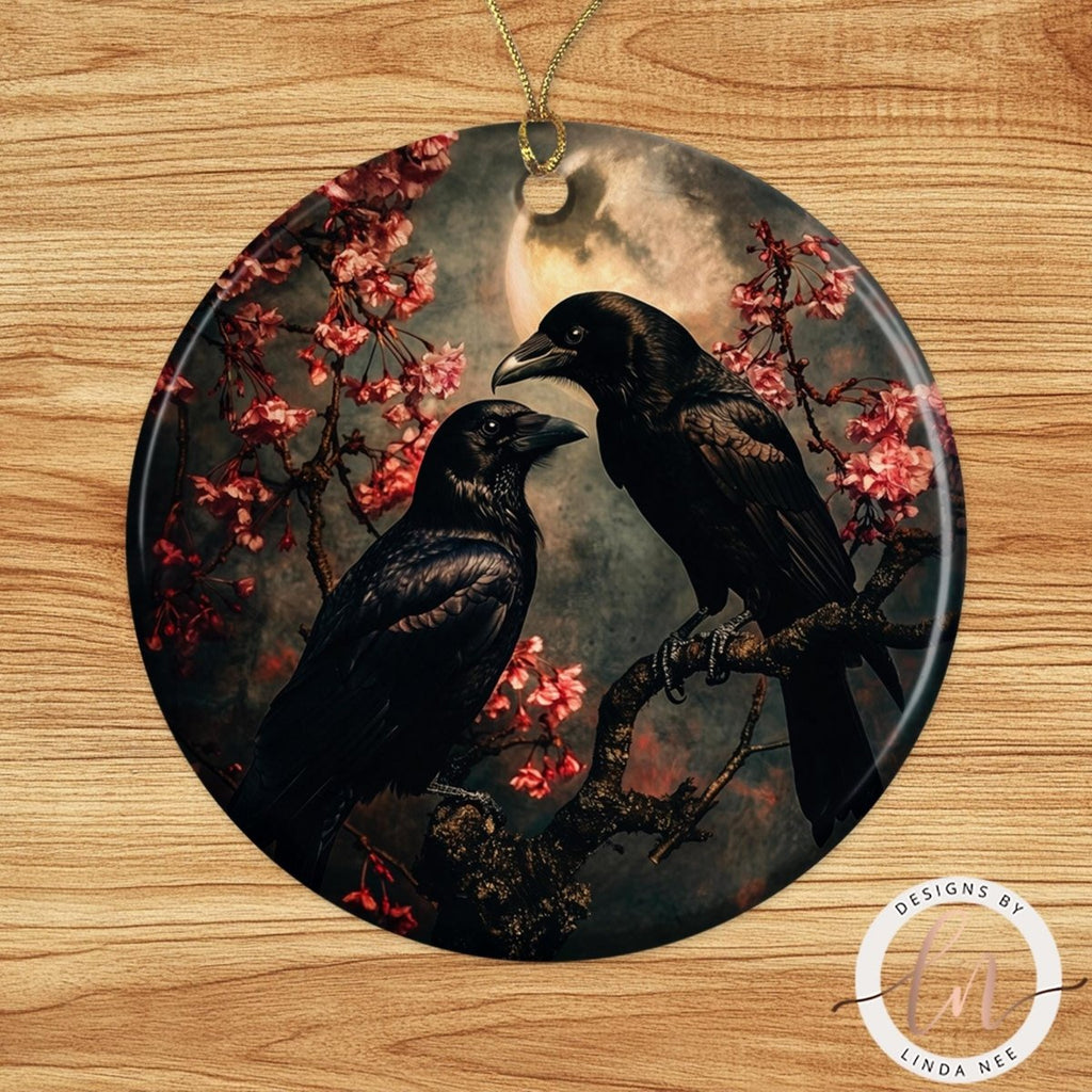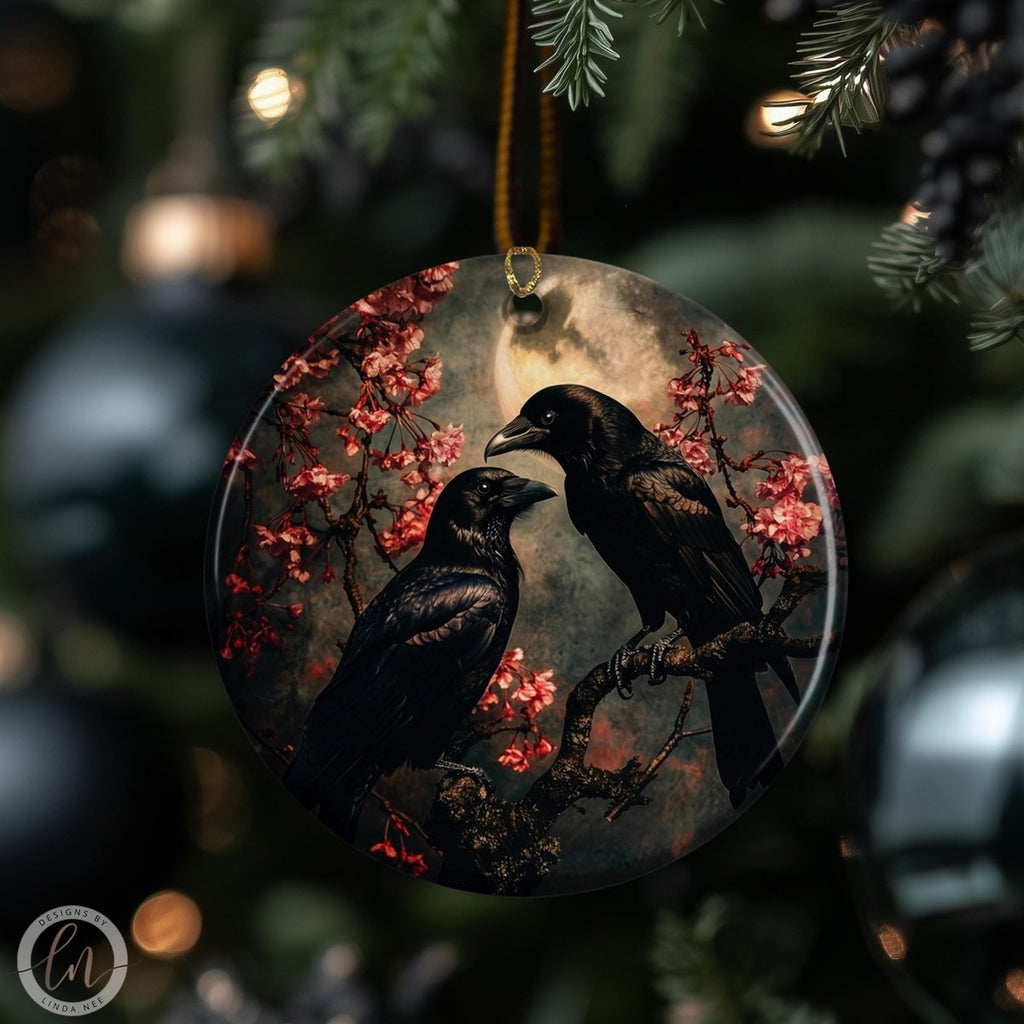 Buy this raven couple Christmas ornament to bring poetic mystery and gothic beauty to your holiday decor. Designed for those who adore moonlit nights and dark romance, this piece transforms any Christmas tree into an elegant winter story. Two ravens sit beneath a glowing sky, surrounded by crimson blossoms — a symbol of connection, loyalty, and the timeless allure of shadow and light. Perfect for collectors of unique Christmas ornaments or anyone curating a tree filled with meaning and emotion.