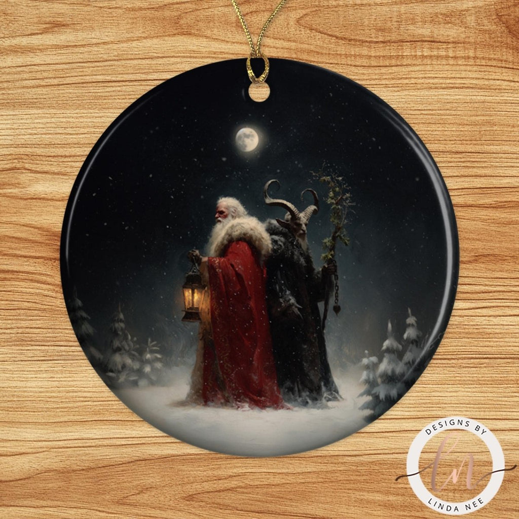 For anyone who loves their Christmas with equal parts wonder and warning, this Santa and Krampus Christmas Ornament brings old-world legend straight to your holiday decor. Santa stands beneath a snowlit sky with lantern in hand while Krampus lurks behind him, horns silhouetted against the moon—moody, story-rich, and perfect for gothic christmas themes, krampusnacht lovers, and anyone drawn to holiday magic with a slightly sinister twist.