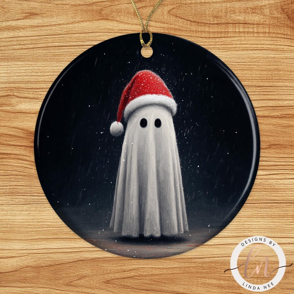 This spooky-cute ghost Christmas ornament blends cozy holiday charm with a hint of eerie winter magic. A tiny sheet ghost in a Santa hat stands in falling snow beneath a dark night sky, perfect for anyone who celebrates Christmas with a little haunted whimsy and year-round spooky-season energy.